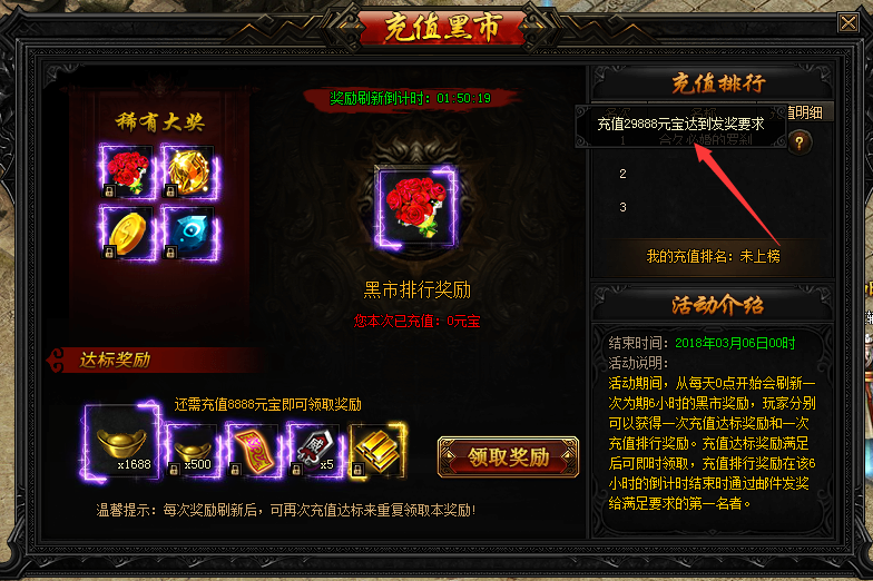 活动期间内,从每天0点开启会刷新一次为期6小时的黑市奖励,玩家分别可以获取一次充值达标和一次充值排行奖励。充值达标满足奖励后即时领取,充值排行奖励在该6小时的倒计时结束时通过邮件发奖给满足需求的第一名。(温馨提示:充值明细内有第一名发奖要求)
